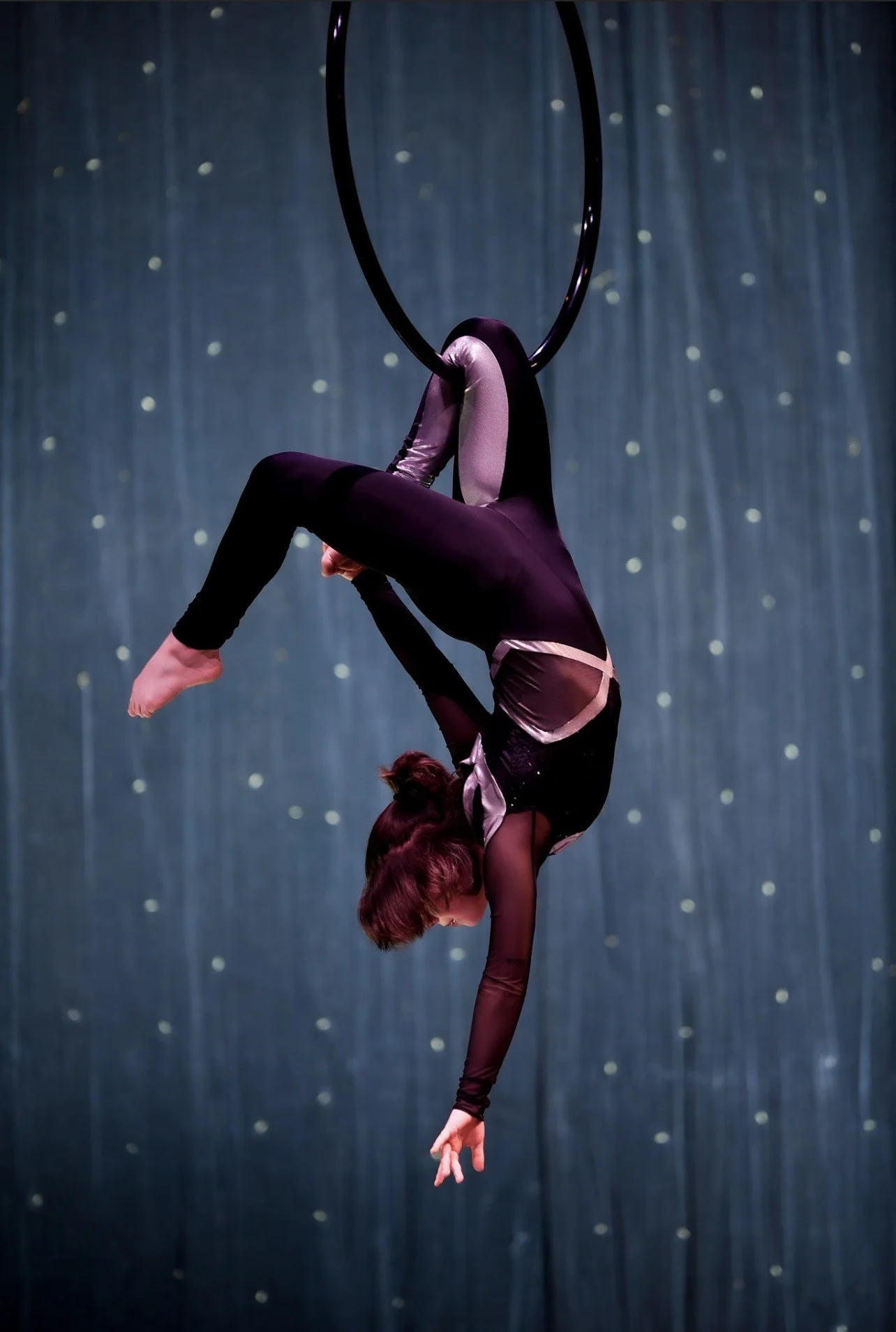 lyra (aerial hoop) is a gynmastic discipline in where the performer uses a metal ring to execute various poses, moves, and trasntions while suspended midair. This skill requires flexibility, strength, coordination which jenna demonstrates with ease.